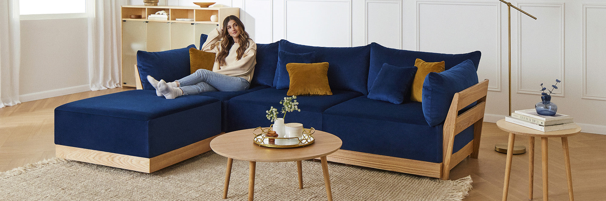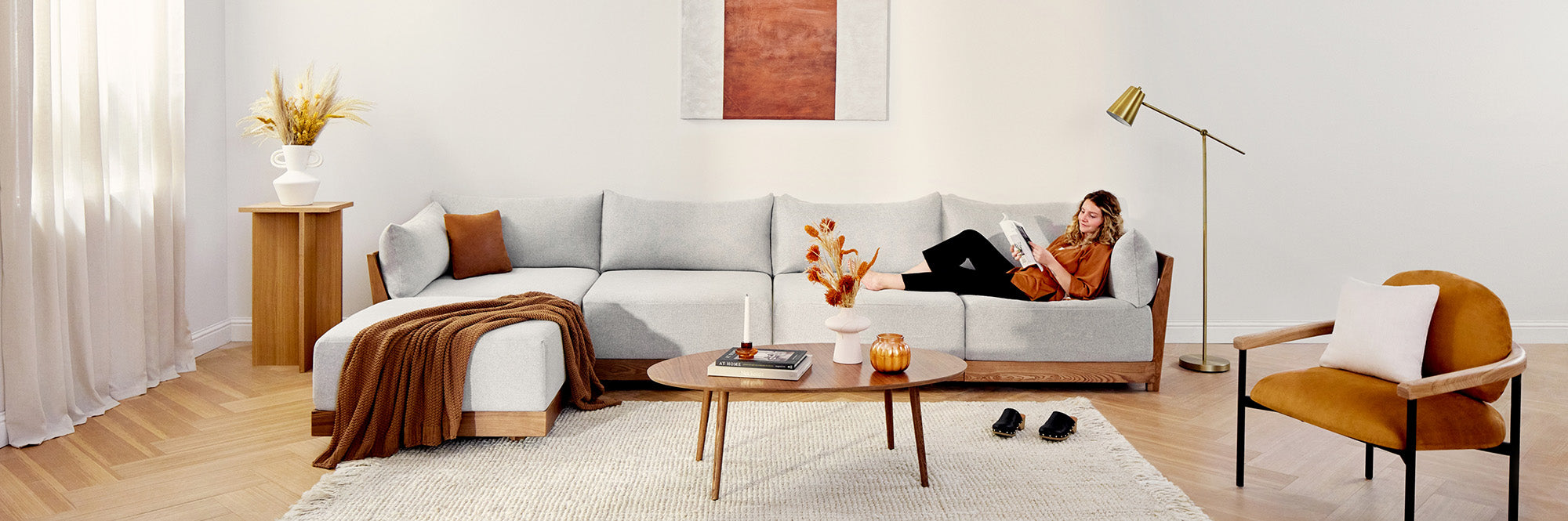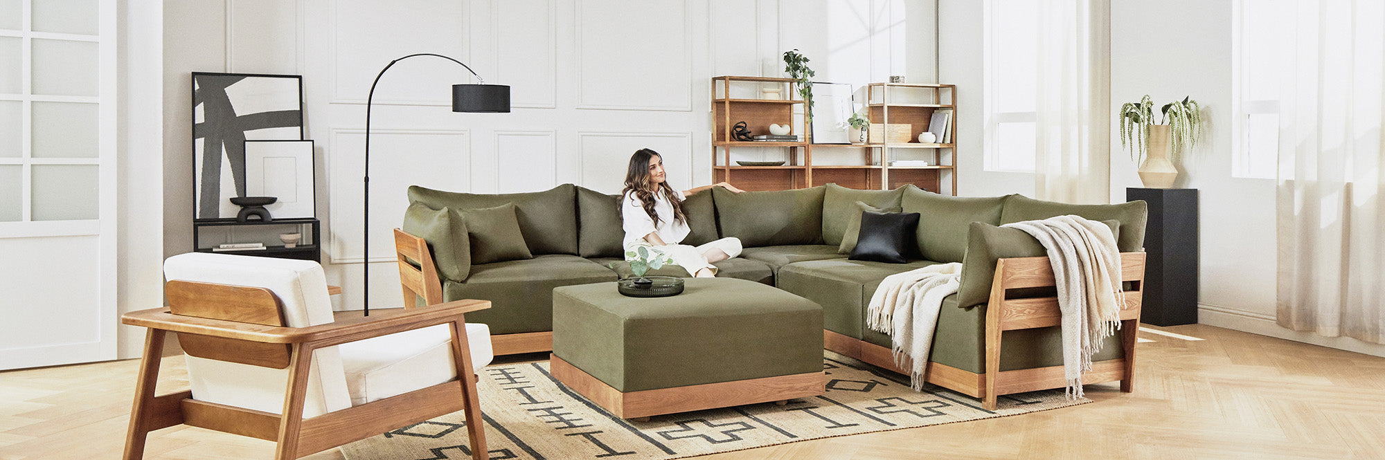 Made to move and adapt with your ever-changing lifestyle. Every patent pending seat block is alike and can be used in the middle, on the end, or as a corner piece in your sofa. Likewise, every slatted solid wood panel is identical and can be used as either an “arm” or a “back”. And the ottomans? Also adaptable! Ottomans can stand alone or serve as an extension to your sofa by connecting to any seat module at its base.